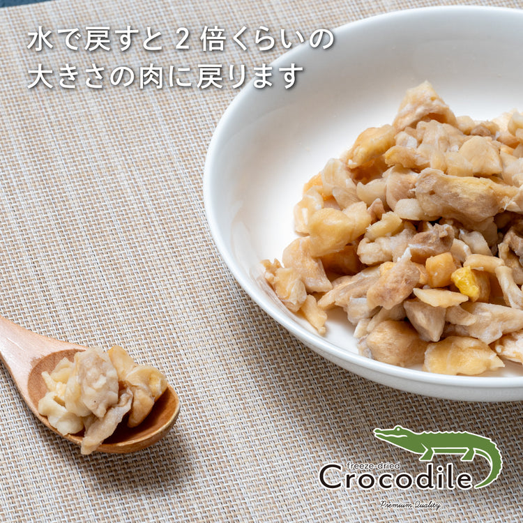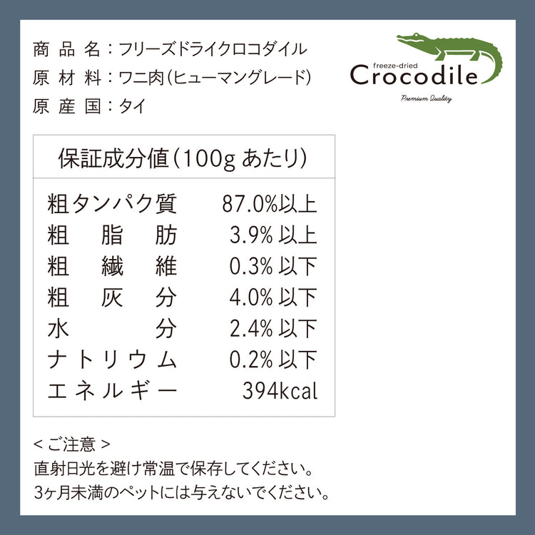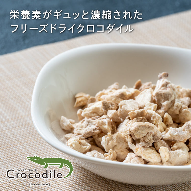 フリーズドライクロコダイルは、厳しい管理体制のもとで育てられたクロコダイルを使用し、国際基準を満たした安全・安心な施設で生産された、まさにヒューマングレードのナチュラルフードです。