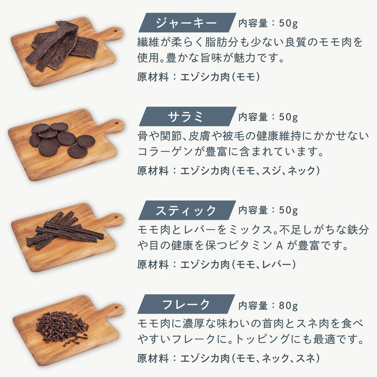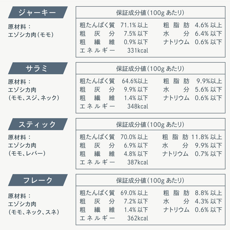 原材料: エゾシカ肉 (モモ、ネック、スネ)